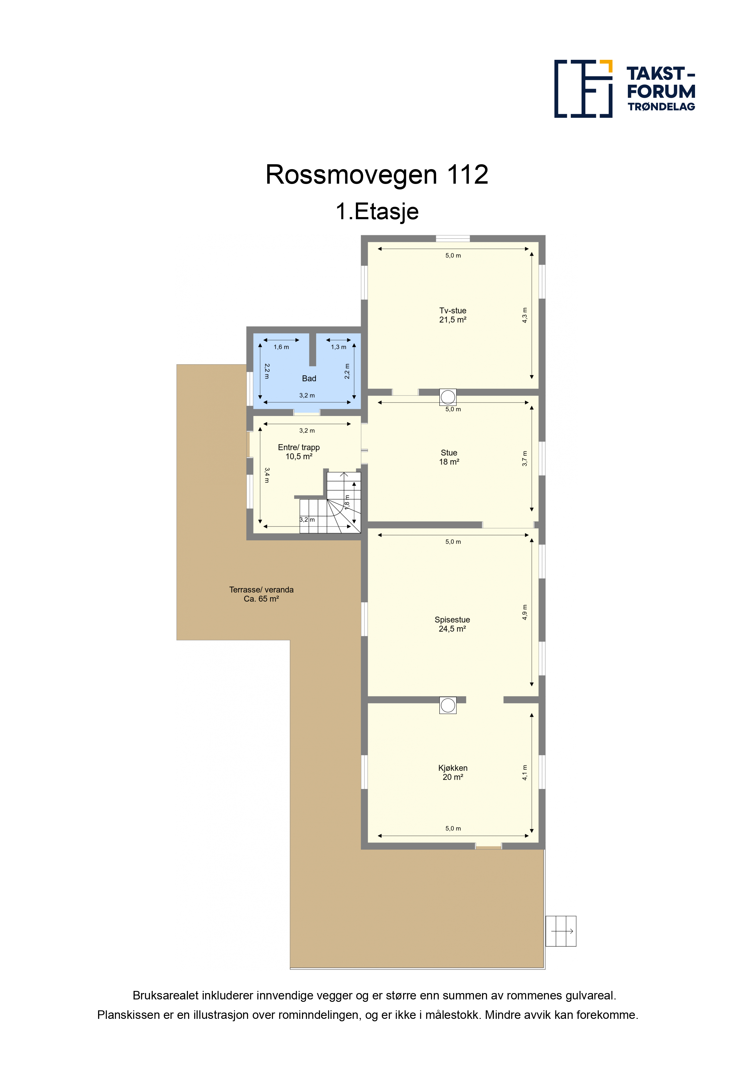 Kjeller Bod: Støpt gulv og ubehandlet vegger. Ubehandlet himling. Bereder, stoppekran og trapp. Uinnredet kjellerrom 1: Støpt gulv og ubehandlet vegger. Plater i himling. Uinnredet kjellerrom 2: Støpt gulv og ubehandlet vegger. Plater i himling. Uinnredet kjellerrom 3: Støpt gulv og ubehandlet vegger. Plater i himling. 1. etasje Entre: Teppe på gulv og malt overflate på vegger. Malt overflate i himling. Trapp. Bad: Belegg på gulv og våtromsplater på vegger. Takess i himling. Gulvvarme. Utstyrt med åpen dusj, servantskap, veggmontert wc, opplegg for vaskemaskin og mekanisk avtrekk. TV-stue: Parkett på gulv og malt overflate på vegger. Malt panel i himling. Panelovn. Stue: Parkett på gulv, tapet og panelplater på vegger. Malt panel i himling. Spisestue: Laminat på gulv og malt overflate på vegger. Panel og malt panel i himling. Vedovn. Kjøkken: Laminat på gulv og malt overflate på vegger. Malt panel i himling. Innredning med opplegg for oppvaskmaskin og mekanisk avtrekksvifte over stekesonen. Det er integrert stekovn og platetopp. Trapperom: Ubehandlet vegger. Ubehandlet himling. Trapp. 2. etasje Gang: Parkett på gulv og malte plater på vegger. Takess og luke til kaldloft i himling. Trapp. Soverom 1: Laminat på gulv og malte plater på vegger. Takess i himling. Soverom 2: Parkett på gulv, malt overflate og panelplater på vegger. Malt overflate i himling. Panelovn. Garderobeskap. Soverom 3: Parkett på gulv, panelplater og tapet på vegger. Malt panel i himling. Skyvedørsgarderobe og sikringsskap. Soverom 4: Parkett på gulv, panelplater og tapet på vegger. Malt panel i himling. Soverom 5: Parkett på gulv, panelplater og tapet på vegger. Malt panel i himling. Omkledningsrom: Parkett på gulv, panelplater og malt overflate på vegger. Malt panel i himling. Garderobeskap. Bad: Flis på gulv og vegger. Panel i himling. Gulvvarme. Utstyrt med badekar, servantskap, wc og mekanisk avtrekk. Eiendommen er gjennomgått av en bygningskyndig og det er utarbeidet en tilstandsrapport. Denne er vedlagt salgsoppgaven. Nedenfor følger informasjon om forhold som har fått TG 2 og TG 3. Forhold som har fått TG2: - Drenering - Grunnmur og fundament - Krypkjeller - Rom under terreng - Vinduer og dører - Yttervegger - Loft (konstruksjonsoppbygging) - Takkonstruksjon - Etasjeskille og gulv på grunn - Ildsted/skorstein - Avløpsrør - Vannledninger - Elektrisk - Varmtvannsbereder - Ventilasjon - Bad, 1. etasje - Bad, 2. etasje Forhold som har fått TG3: - Støttemur - Utstyr på tak - Trapp