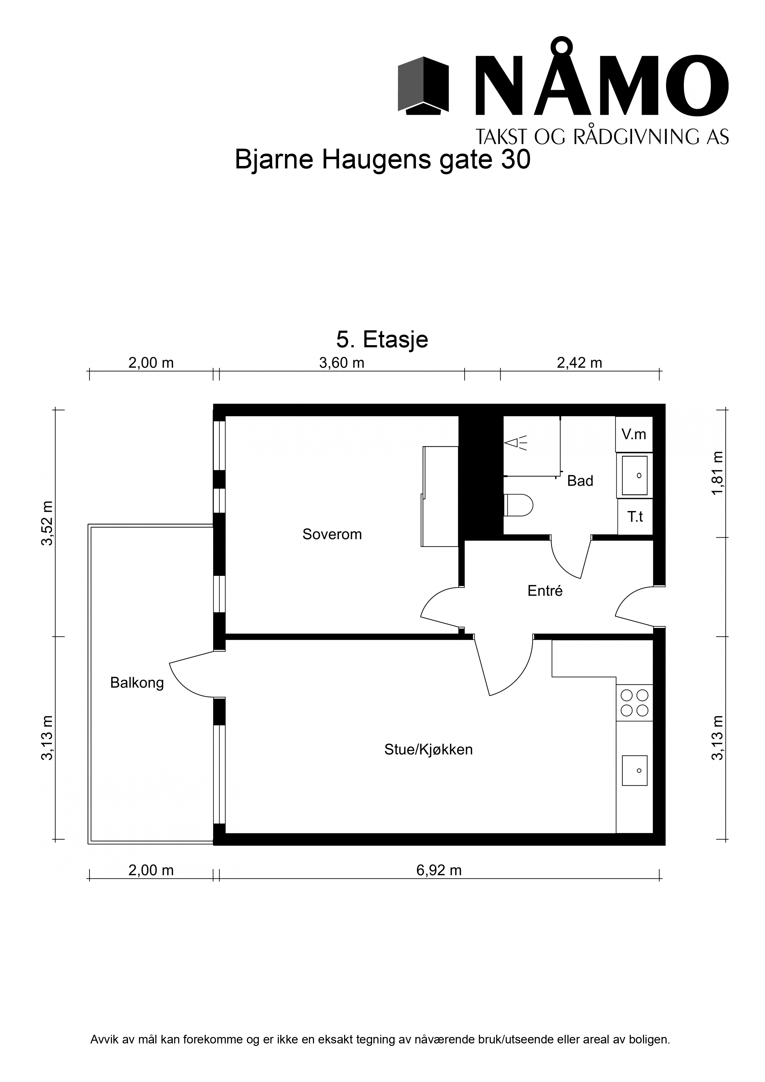 5.etajse: Entré, bad, soverom, stue/kjøkken og balkong.