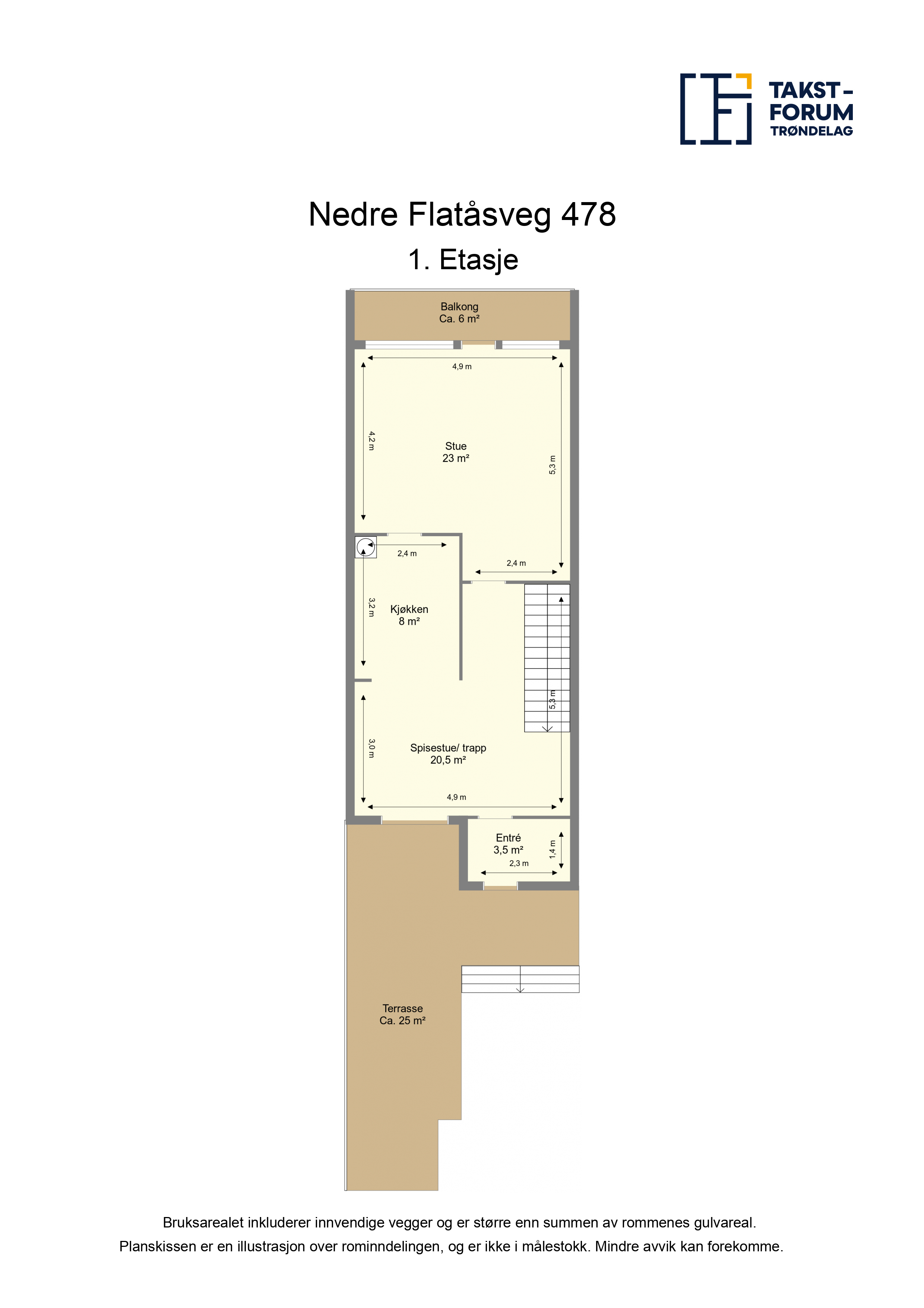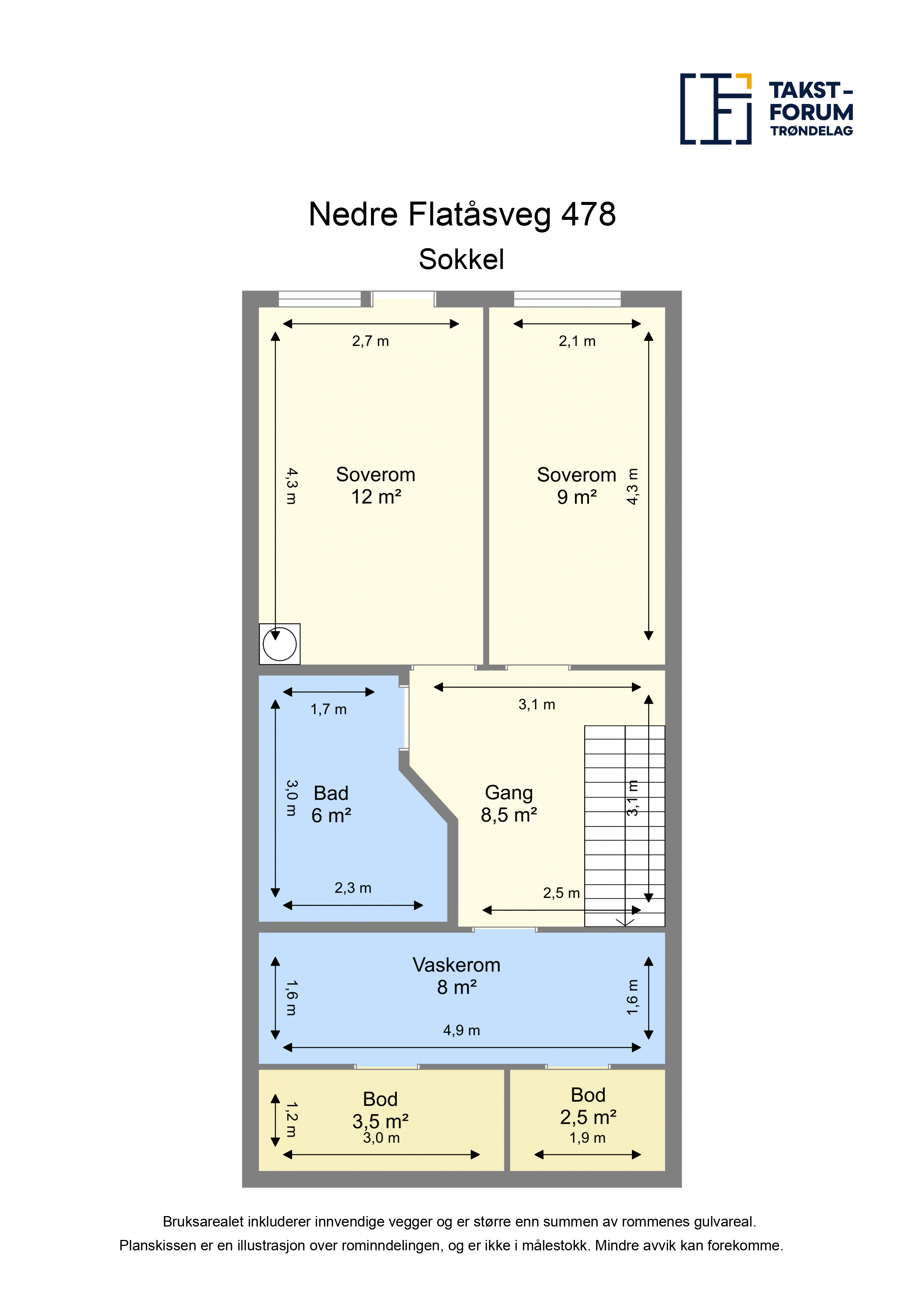 AREAL Areal i salgsoppgaven er hentet fra tilstandsrapporten. Boligens areal oppgis i BRA (bruksareal), som deles i underkategoriene BRA-i (arealet innenfor boenheten), BRA-e (arealet utenfor boenheten(e) og som tilhører denne, slik som for eksempel boder hvor adkomsten er utenfor boenheten), og BRA-b (arealet av innglasset balkong, veranda eller altan når denne er tilknyttet boenheten). TBA er arealet av terrasser, åpne balkonger og åpen altan tilknyttet boenheten.GUA (gulvareal) er ikke måleverdig gulvareal som skyldes skråtak og lav himlingshøyde. GUA oppgis som en sum av BRA og ALH (som er areal med lav himlingshøyde). Arealoppmåling er foretatt av takstmann etter bransjestandarden "Takstbransjens retningslinjer ved arealmåling av boliger". Retningslinjene har NS 3940:2012 som utgangspunkt, men inneholder presiseringer for arealbegreper og definisjoner i forbindelse med arealmåling. De forskjellige rom i boligen er beskrevet etter dagens bruk av rommet på befaringstidspunktet, selv om bruken av rommet kan være i strid med tidligere eller gjeldende byggeforskrifter. Benevnelsen av de enkelte rom fastsettes etter skjønn fra takstmannen. D-NUMMER Dersom kjøper er utenlandsk statsborger kreves det at vedkommende har D-nummer til erstatning for norsk personnummer. Søknad om D-nummer sendes til Kartverket samtidig med innsending av skjøtet for tinglysing. Kartverket oppbevarer skjøtet inntil kjøper har fått D-nummer av skatteetaten. Skjøtet vil bli tinglyst så snart Kartverket har mottatt kjøpers D-nummer fra Skatteetaten. Søknad om D-nummer i forbindelse med tinglysing av skjøte kan medføre at oppgjør og utbetaling til selger blir forsinket. Kjøper må i disse tilfellene ta forbehold i bud om at D-nummer blir gitt, samt at dette kan medføre forsinket utbetaling til selger. Kontakt megler for informasjon før budgivning. SALGSSUM Etter aksept av bud, vil eiendommens salgssum bli meddelt de som ev. måtte etterspørre denne. Eiendommens salgssum vil bli offentlig tilgjengelig ved overføring av hjemmel. SAMARBEIDSPARTNERE Foretaket samarbeider med følgende foretak som tilbyr produkter eller tjenester i forbindelse med oppdraget: - Help forsikring - Södeberg & Partners - Banker i Eika-alliansen - Leverandører knyttet til Aktiv pluss (for eksempel flyttehjelp) - Leverandører knyttet til Visma Meglerfront (for eksempel strømleverandører)