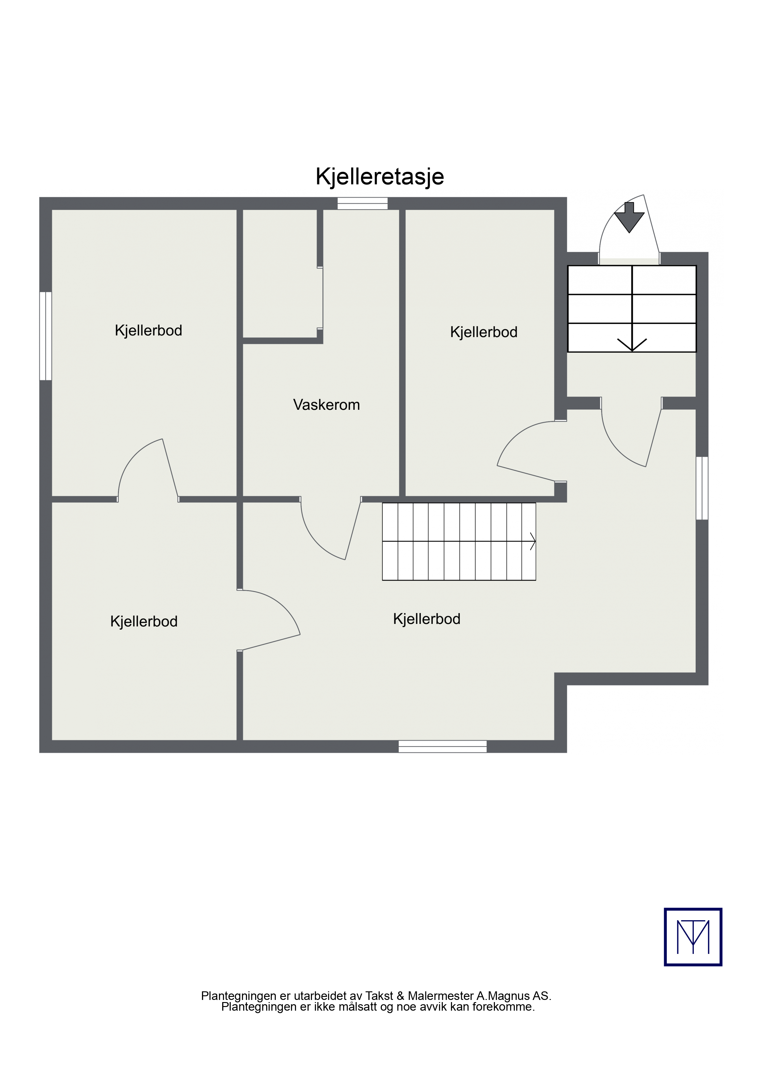 Kjeller: Entré/gang med trapp, kjellerbod 1, kjellerbod 2, kjellerbod 3, vaskerom/bod og kjellerbod 4. 1. etasje: Entré, gang med trapp, bad spisestue, kjøkken, soverom 4 og tv-stue. 2. etasje: Gang med trapp, bad, bod, soverom 1, soverom 2 og soverom 3.
