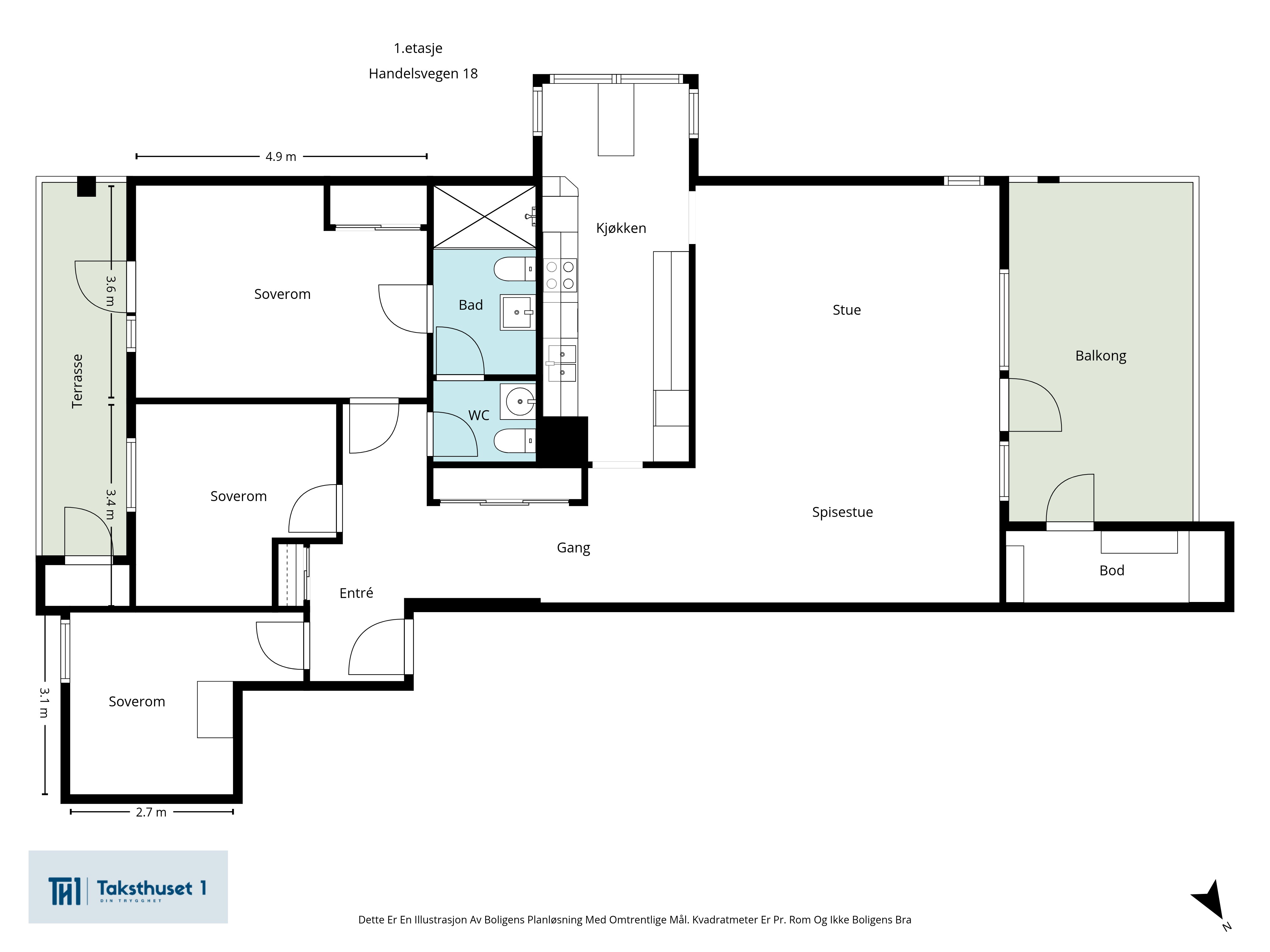- Entrè, gang, stue, kjøkken, bad, toalettrom og 3 soverom