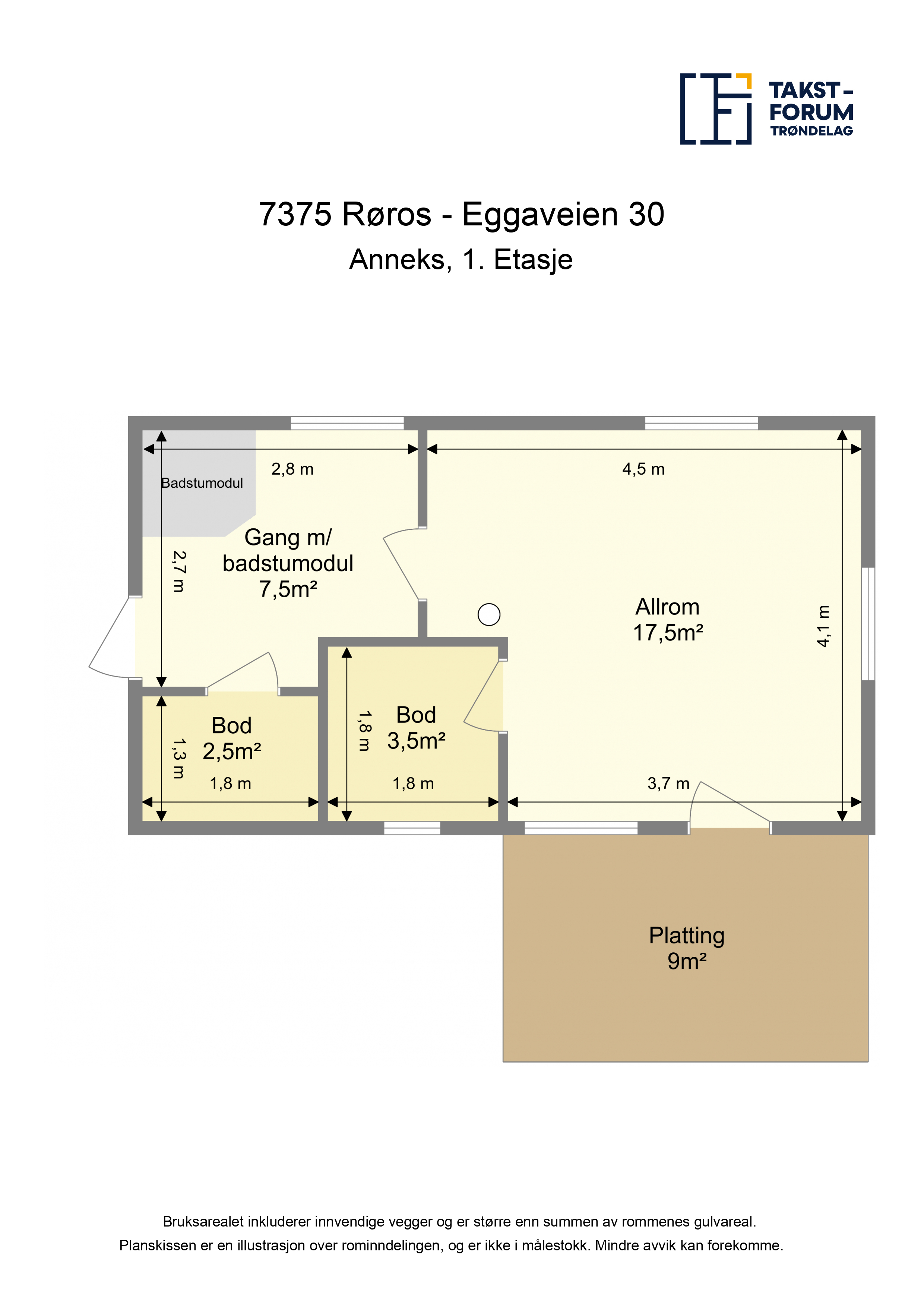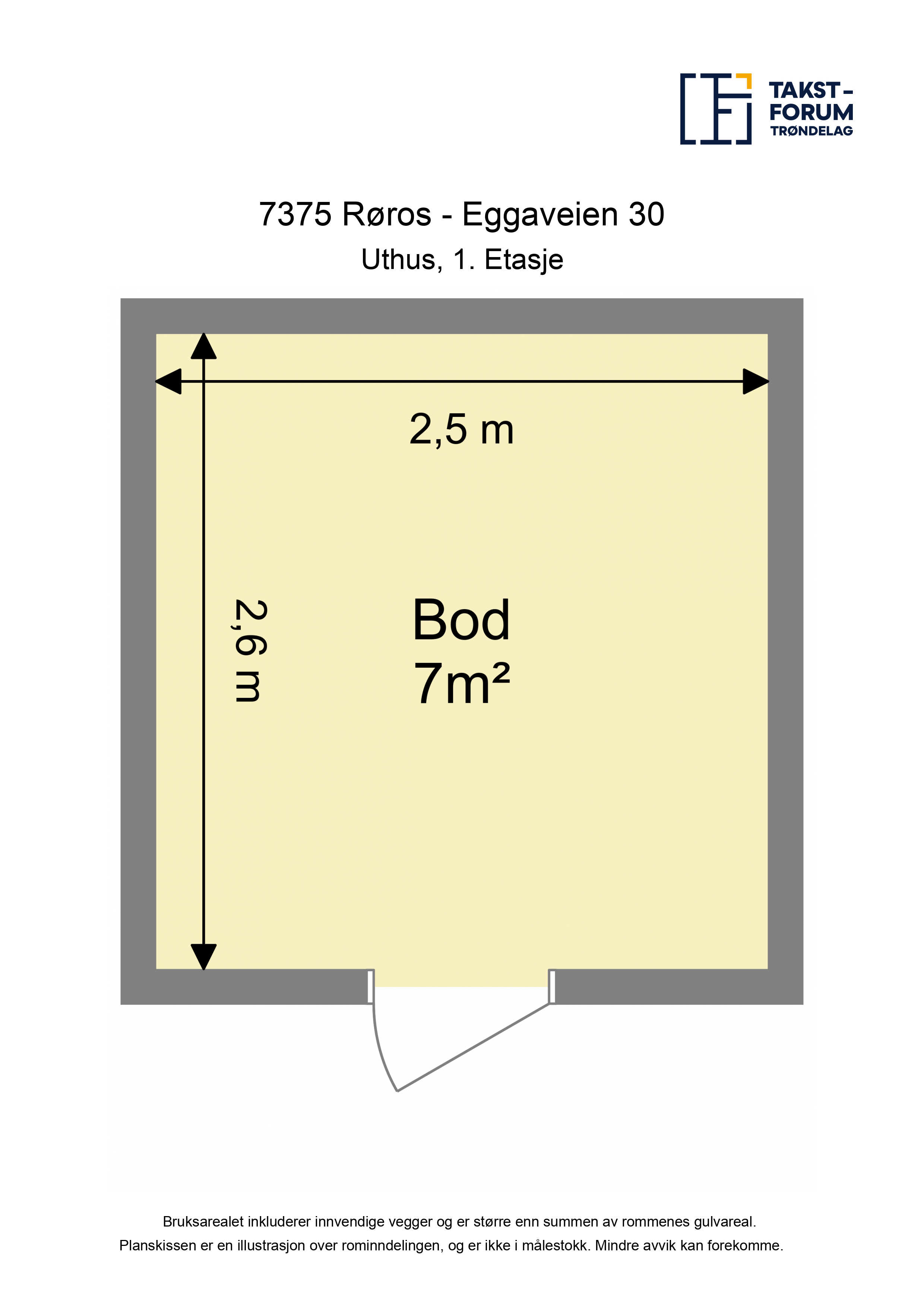 Fritidsbolig BRA-i: 1. etasje: Entre, soverom, bad, kjøkken, stue og spisestue. Loft: Gang og to soverom. Uthus BRA-e: 1. etasje: Bod. Anneks BRA-e: 1. etasje: Allrom, gang og to boder. Gapahuken har ikke måleverdig areal. Ca 11 kvm gulvareal.