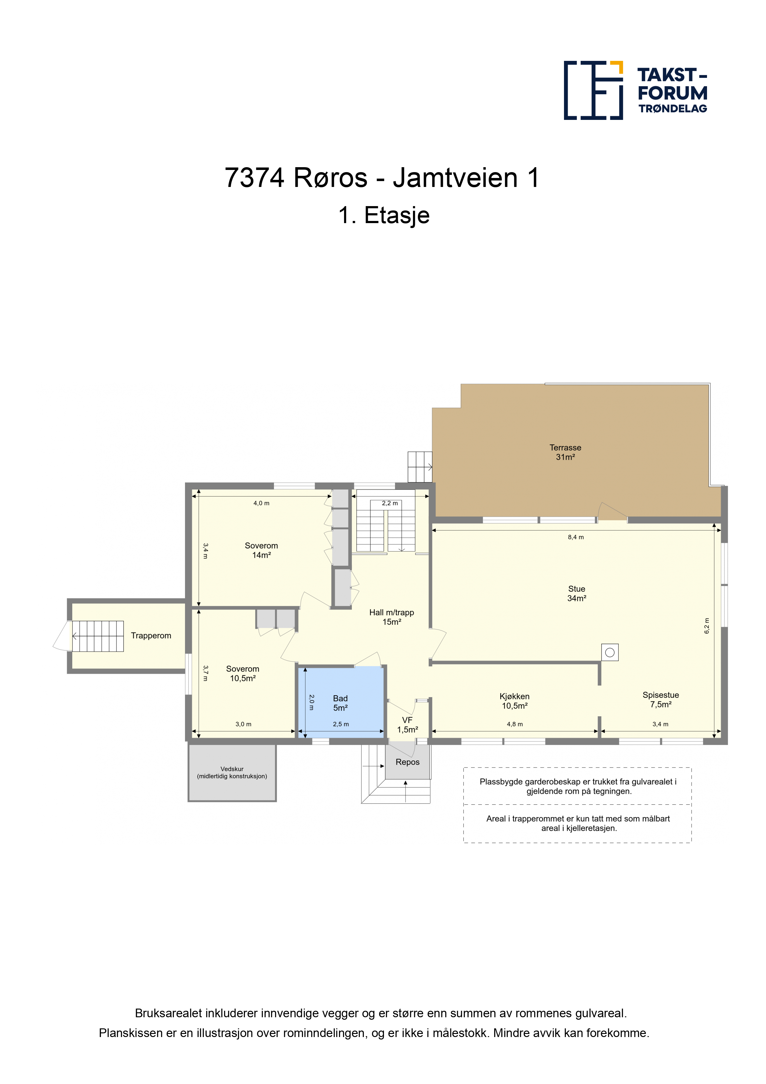 Forhold som har fått TG3 i tilstandsrapporten: - Støttemur - Taktekking: Opprinnelig del - Utstyr på tak Forhold som har fått TG2 i tilstandsrapporten: - Drenering - Grunnmur og fundament: Opprinnelige murer - Rom under terreng - Balkong, terrasse, platting - Vinduer og dører: Eldre vinduer og dører - Yttervegger - Loft (konstruksjonsoppbygging): Opprinnelig del, kaldloft - Renner og nedløp - Takkonstruksjon: Opprinnelig del - Etasjeskille og gulv på grunn - Ildsted/Skorstein - Kjøkken: Overflater og innredning - Trapp: Interntrapp mellom etasjer - Trapp: Utvendig trapp ved terrasse - Avløpsrør - Vannledninger - Varmtvannsbereder - Ventilasjon - Våtrom: Bad, 1. etasje - Øvrig: Overflater Standard Kjeller Vindfang: Flis på gulv og behandlet panel på vegger. Takess i himling. Gulvvarme. Trapperom: Støpt gulv og ellers uinnredet. Bad: Flis på gulv og flis på vegger. Takess i himling. Gulvvarme. Utstyrt med wc, servant i innredning, innfellbare dusjdører og mekanisk avtrekk. Bod/vask: Støpt gulv og plater på vegger. Takess i himling. Bod 2: Støpt gulv. Plater og mur på vegger. Panel i himling. Bereder. Bod 3: Støpt gulv. Panel, plater og mur på vegger. Asbestplater i himling. Bod 4: Støpt gulv og plater og mur på vegger. Malt panel i himling. Hall: Teppe på gulv og tapet på vegger. Takess i himling. Sikringsskap, trapp og skap. Soverom: Teppe på gulv og malte plater på vegger. Takess i himling. Garderobeskap. Kjellerstue: Teppeflis på gulv og tapet på vegger. Takess i himling. Peis. 1. etasje Vindfang: Laminat på gulv og behandlet panel på vegger. Malt overflate i himling. Bad: Belegg på gulv og våtromsplater på vegger. Takess i himling. Gulvvarme. Utstyrt med innfellbare dusjdører, servant i innredning, opplegg for vaskemaskin, veggmontert wc og mekanisk avtrekk. Hall: Teppeflis på gulv og behandlet panel på vegger. Plater og luke til kaldloft i himling. Varmepumpe. Trapp og garderobeskap. Kjøkken: Laminat på gulv. Flis og brystningspanel på vegger. Plater i himling. Innredning med opplegg for oppvaskmaskin og mekanisk avtrekksvifte over stekesonen. Stue: Parkett på gulv og tapet på vegger. Plater i himling. Vedovn, peis og varmepumpe. Utgang til terrasse. Soverom 1: Laminat på gulv og tapet på vegger. Plater i himling. Garderobeskap. Soverom 2: Teppe på gulv og tapet på vegger. Malt overflate i himling. Garderobeskap. Trapperom: Uinnredet. Trapp.