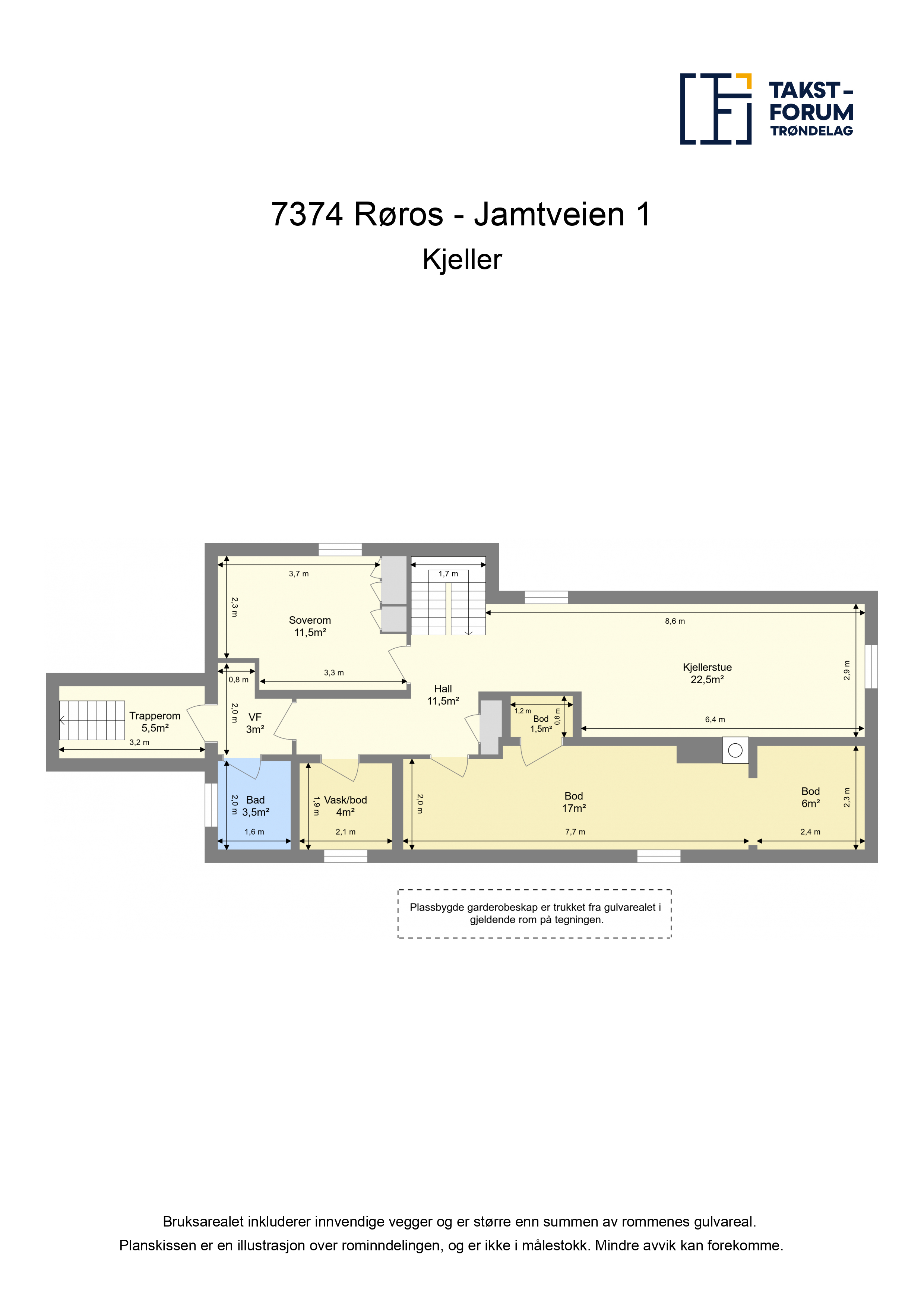 BRA-i: Kjeller: Vindfang, trapperom, bad, hall, soverom, kjellerstue og fire boder. 1. etasje: Vindfang, bad, hall, kjøkken, stue, to soverom og trapperom.