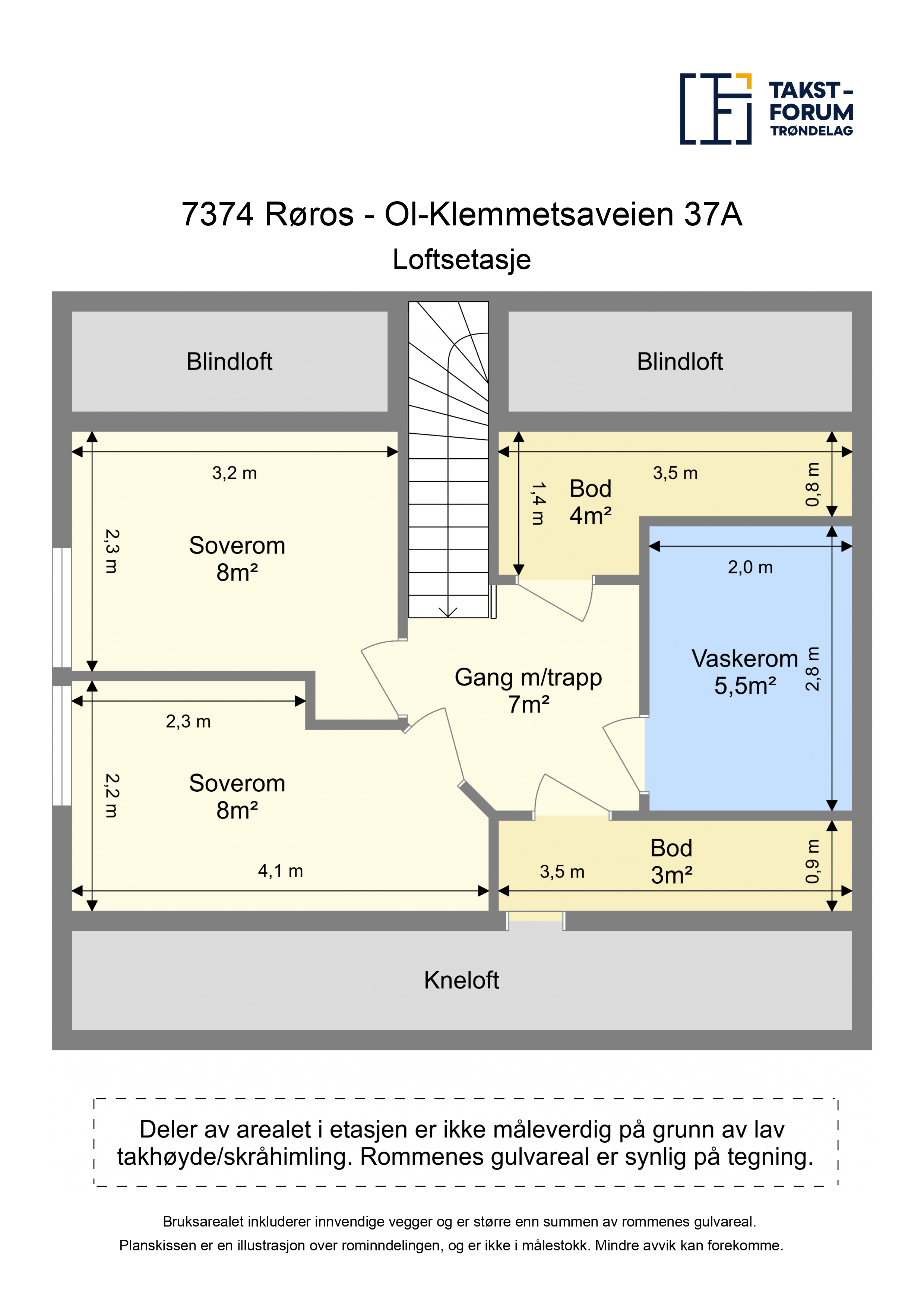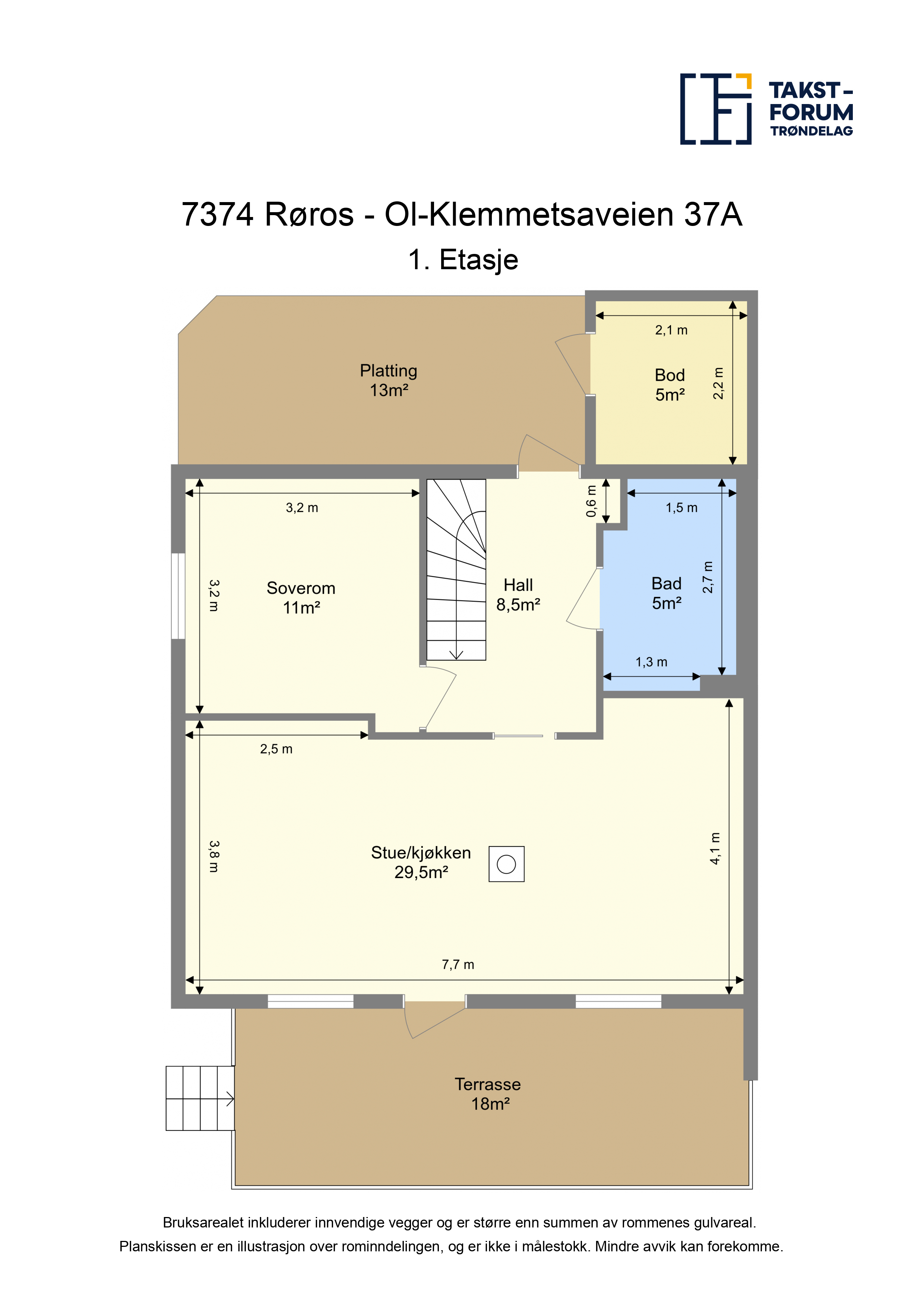 BRA-i: 1. etasje: Stue/kjøkken, hall, soverom, bad. BRA-i/ALH: Loftsetasje: Gang, to soverom, vaskerom og to boder. BRA-e: 1. etasje: Bod.