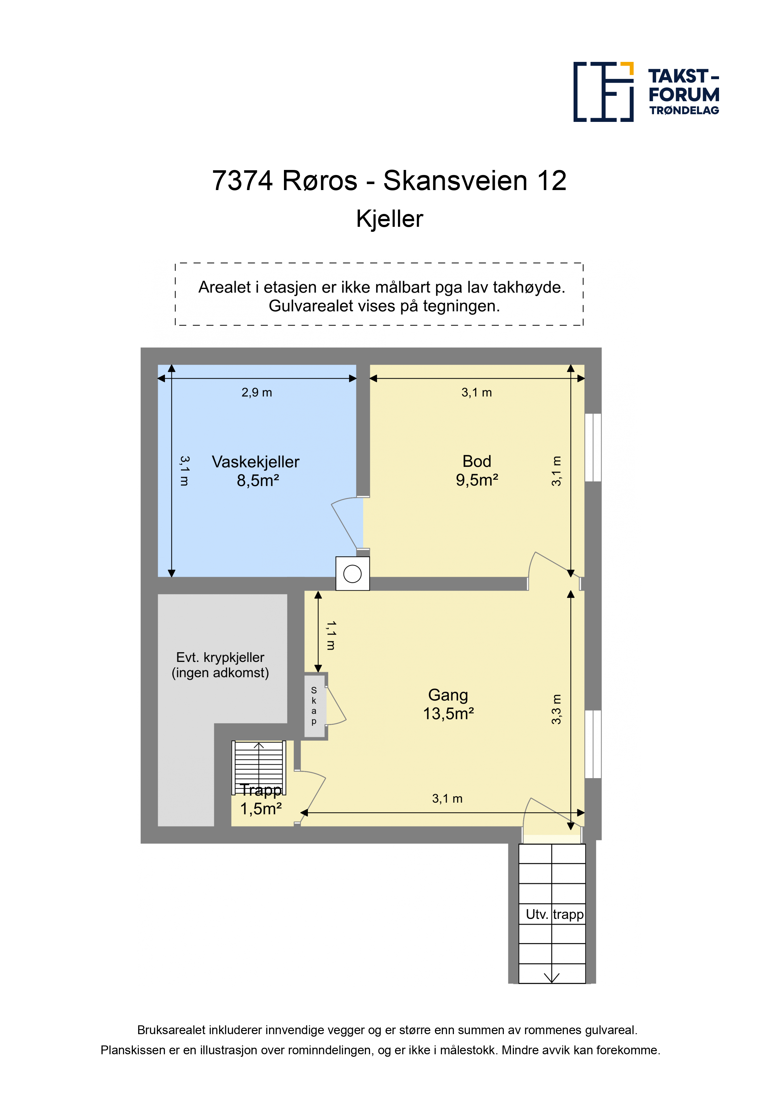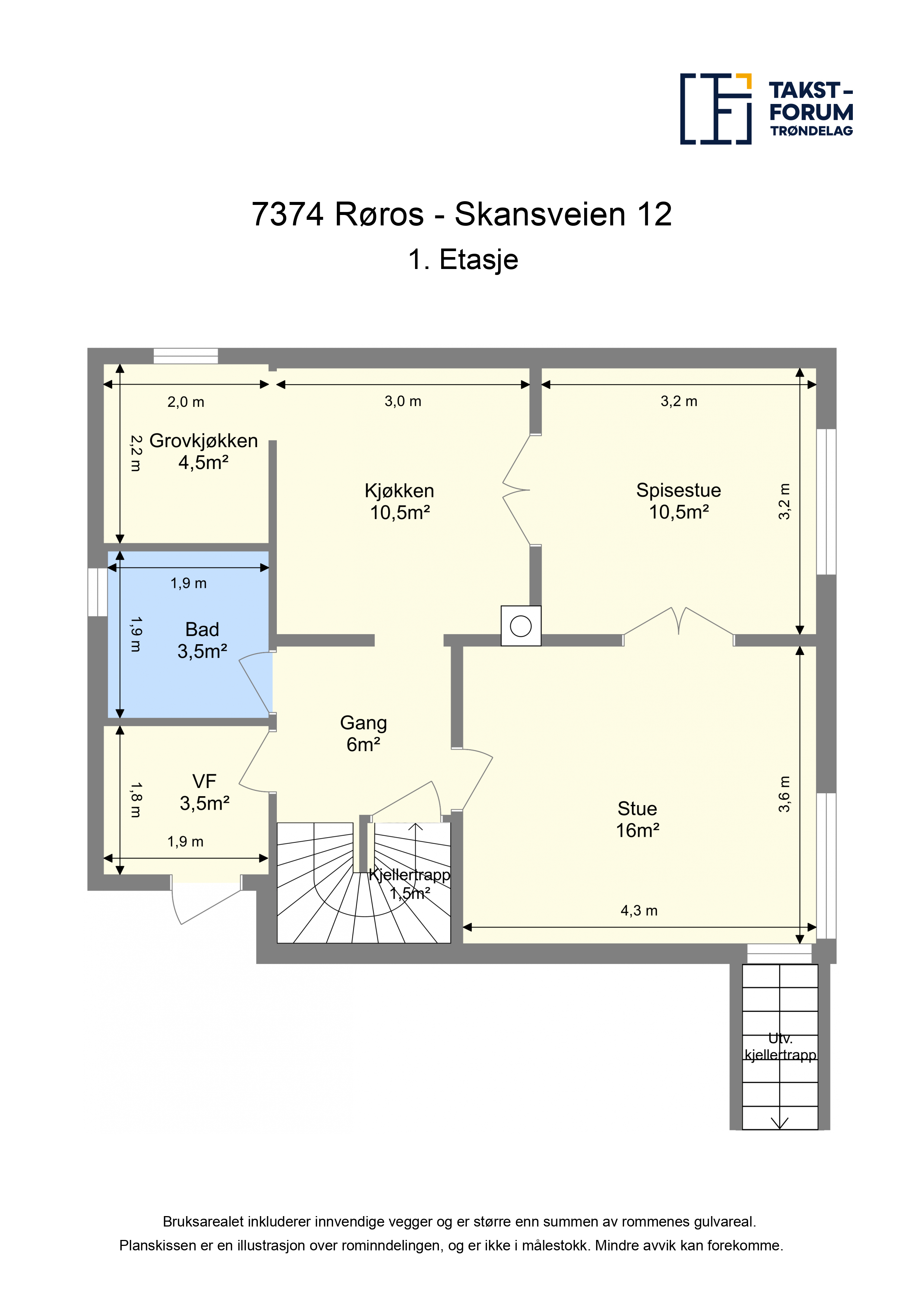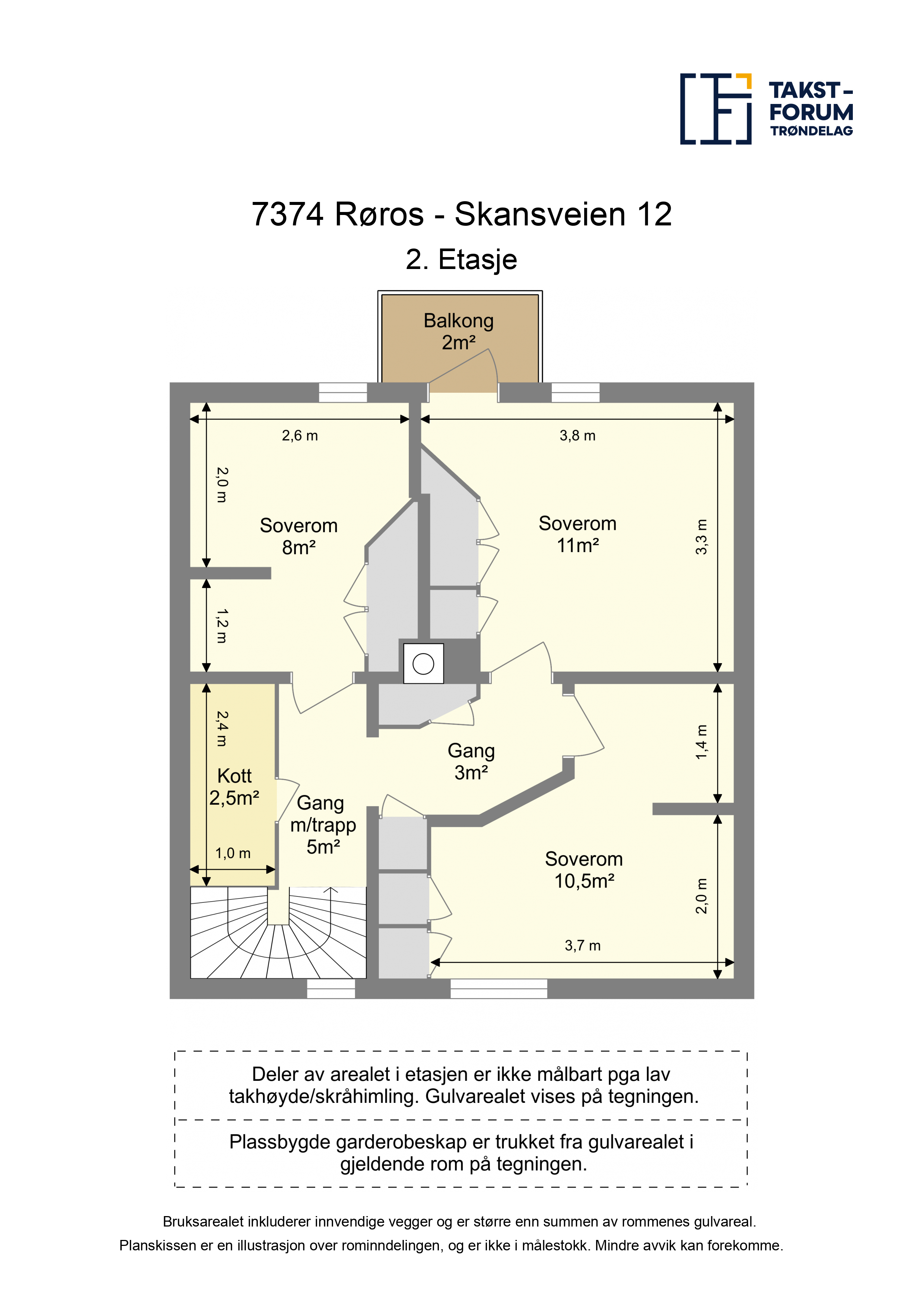 Forhold som har fått til TG3 i tilstandsrapporten: - Støttemur - Utstyr på tak Forhold som har fått TG2 i tilstandsrapporten: - Drenering - Grunnmur og fundament - Krypkjeller - Rom under terreng - Balkong, terrasse, platting - Vinduer og dører: Innerdører og kjellerdør - Yttervegger - Renner og nedløp - Takkonstruksjon - Etasjeskille og gulv på grunn - Ildsted/Skorstein - Kjøkken - Trapp - Avløpsrør - Vannledninger - Elektrisk - Ventilasjon - Øvrig: Vaskekjeller Kjeller Trapperom: Støpt gulv og malt overflate på vegger. Trapp. Gang: Støpt gulv og malt overflate på vegger. Malt panel i himling. Bod: Støpt gulv og malt overflate på vegger. Malt overflate i himling. Skyllekum. Vaskekjeller: Malt betonggulv og malt overflate på vegger. Malt overflate i himling. Panelovn. Utstyrt med bereder, stoppekran, vannmåler, servant, wc og opplegg for vaskemaskin. 1. etasje Vindfang: Flis på gulv og malt panel på vegger. Malt panel i himling. Panelovn. Gang: Tregulv og malt panel på vegger. Malt panel i himling. Panelovn. Trapp. Bad: Belegg på gulv og våtromsplater på vegger. Malt panel og downlights i himling. Gulvvarme. Utstyrt med innfellbare dusjdører, servant i innredning, wc og mekanisk avtrekk. Trapperom: Malt og ubehandlet overflate på vegger. Trapp. Kjøkken 1: Tregulv og malt panel på vegger. Det er flis på vegg over benk. Malt panel i himling. Vedovn. Det er integrert stekovn og platetopp. Kjøkken 2 (grovkjøkken): Flis på gulv og malt panel på vegger. Malt panel og downlights i himling. Panelovn. Det er integrert oppvaskmaskin og kjøleskap. Spisestue: Tregulv og malt panel på vegger. Malt panel i himling. Panelovn. Stue: Tregulv og malt panel på vegger. Malt panel i himling. Vedovn. 2. etasje Gang 1: Tregulv og malt panel på vegger. Malt panel i himling. Trapp. Soverom 1: Tregulv og malt panel på vegger. Malt panel i himling. Garderobeskap. Soverom 2: Tregulv og malt panel på vegger. Malt panel i himling. Garderobeskap. Soverom 3: Tregulv og malt panel på vegger. Malt panel i himling. Garderobeskap. Gang 2: Tregulv og malt panel på vegger. Malt panel i himling. Garderobeskap og sikringsskap. Kott: Malt overflate på gulv. Panel og uinnredet på vegger. Malt panel i himling.