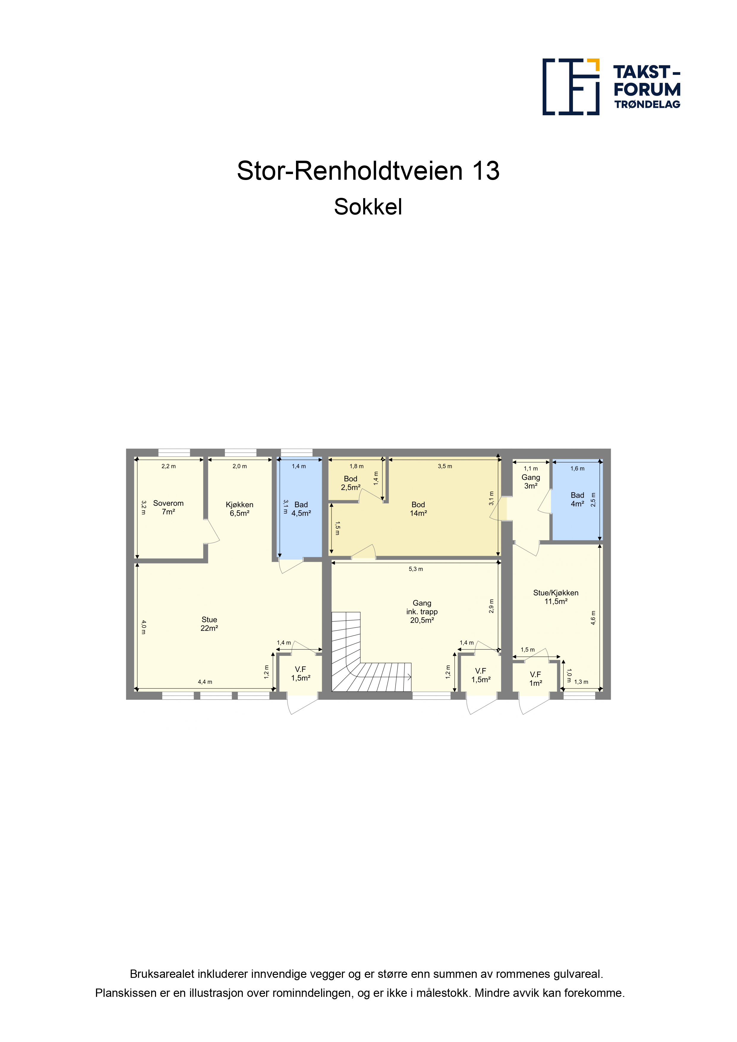 Sokkel: Tre vindfang, to stuer, to kjøkken, to ganger, to bad og soverom. To boder. 1. etasje: Gang, stue, kjøkken, vaskerom, toalett, bad og tre soverom.