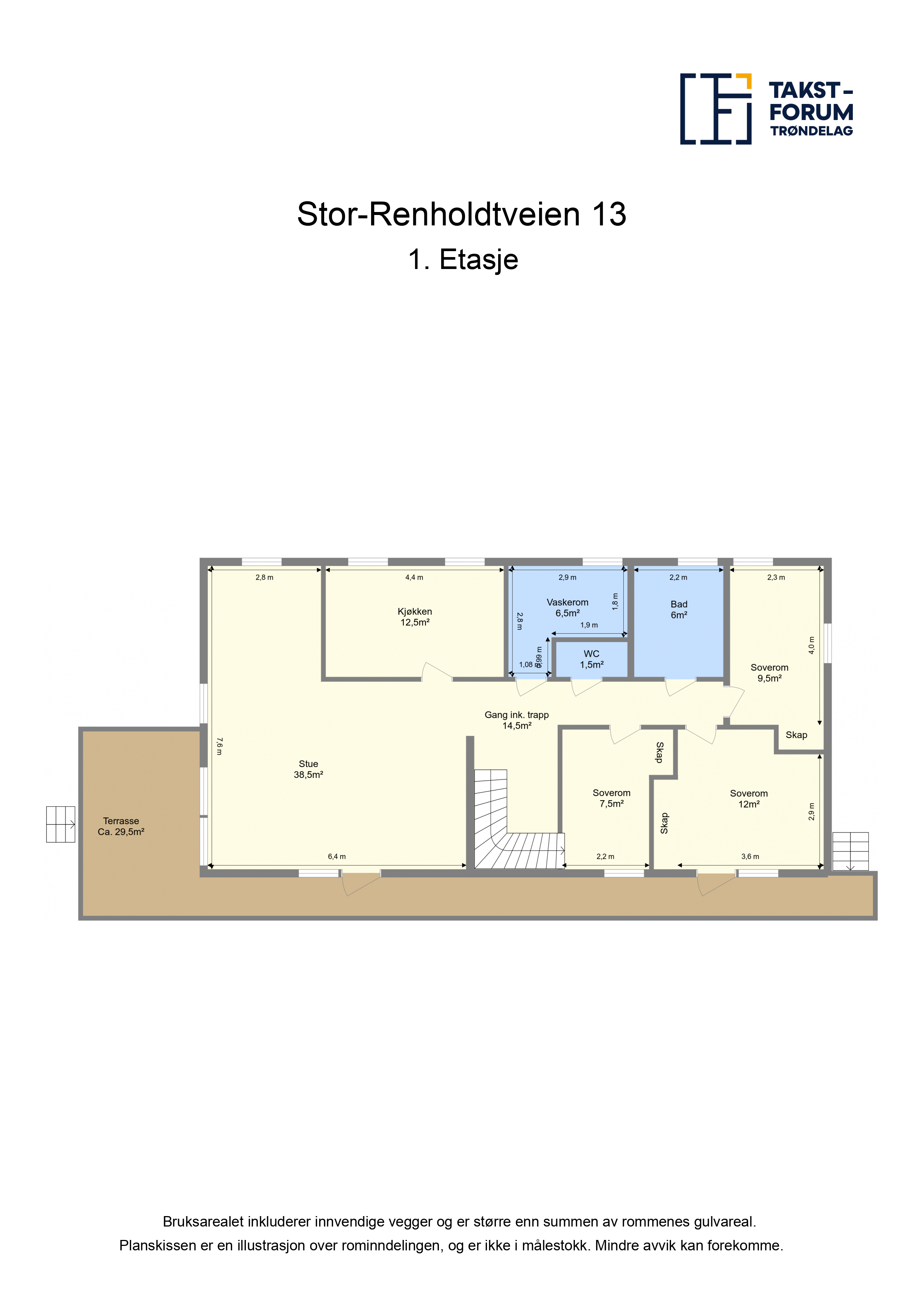 Forhold som har fått TG3 i tilstandsrapporten: - Drenering - Utstyr på tak - Etasjeskille og gulv på grunn - Elektrisk - Bad 1. etasje - Bad leilighet - Vaskerom Forhold som har fått TG2 i tilstandsrapporten: Grunnnmur og fundament Rom under terreng Balkong, terrasse og platting Vinduer og dører Yttervegger Loft Taktekking Ildsted/skorstein Toalettrom Trapp Avløpsrør Vannledninger Varmtvannsbereder Ventilasjon Bad 1. etasje Bad leilighet Vaskerom Standard: Sokkel Bod 1: Støpt gulv og panel på vegger. Panel i himling. Bereder, stoppekran, vannmåler og sikringsskap. Bod 2: Belegg på gulv og panel på vegger. Panel i himling. Vindfang 1: Laminat på gulv og panelplater på vegger. Malt panel i himling. Stue 1: Laminat på gulv og panelplater på vegger. Gulvvarme. Malt panel i himling. Kjøkken 1: Laminat på gulv og panelplater på vegger. Malt panel i himling. Innredning med mekanisk avtrekksvifte over stekesonen. Det er integrert stekovn og platetopp. Gang 1: Laminat på gulv og panelplater på vegger. Malt panel i himling. Gulvvarme. Sikringsskap. Bad 1: Belegg på gulv og våtromsplater på vegger. Malt panel i himling. Gulvvarme. Utstyrt med servantskap, dusjkabinett, wc, bereder, mekanisk avtrekk, rørfordelingsskap og opplegg for vaskemaskin. Vindfang 2: Skifer på gulv og malt panel på vegger. Malt panel i himling. Gang 2: Skifer på gulv og malt panel på vegger. Malt panel i himling. Gulvvarme. Trapp. Vindfang 3: Laminat på gulv, og malt overflate og malt panel på vegger. Malt overflate i himling. Gulvvarme. Sikringsskap. Stue 2: Laminat på gulv og malt panel på vegger. Malt overflate i himling. Gulvvarme og vedovn. Kjøkken 2: Laminat på gulv, panelplater på vegger og laminatplater over benkeplaten. Malt overflate i himling. Gulvvarme. Innredning med mekanisk avtrekksvifte over stekesonen. Det er integrert oppvaskmaskin, stekovn, platetopp og kjøl/fryseskap. Bad 2: Flis på gulv og flis på vegger. Malt overflate i himling. Gulvvarme. Utstyrt med dusjvegg, servantskap, wc, mekanisk avtrekk og opplegg for vaskemaskin. Soverom: Laminat på gulv og panelplater på vegger. Malt overflate i himling. Garderobeskap. 1. etasje Gang: Parkett på gulv, og brystpanel og malt tapet på vegger. Takess i himling. Varmepumpe. Trapp. Stue: Parkett på gulv og malt panel på vegger. Takess i himling. Vedovn. Utgang til terrasse. Kjøkken: Belegg på gulv og malt overflate på vegger. Takess i himling. Innredning med mekanisk avtrekksvifte over stekesonen og opplegg for oppvaskmaskin. Det er integrert stekovn og platetopp. Vaskerom: Belegg på gulv og malte plater på vegger. Takess i himling. Utstyrt med skyllekum, opplegg for vaskemaskin og naturlig avtrekk. Toalett: Flis på gulv og flis på vegger. Takess i himling. Utstyrt med servant, wc og naturlig avtrekk. Bad: Flis på gulv og flis på vegger. Takess i himling. Gulvvarme. Utstyrt med servantskap, dusjhjørne, wc og naturlig avtrekk. Soverom 1: Laminat på gulv og malt tapet på vegger. Takess i himling. Panelovn. Garderobeskap. Soverom 2: Belegg på gulv og malt tapet på vegger. Takess og luke til kaldloft i himling. Garderobeskap og utgang til balkong. Soverom 3: Belegg på gulv og malt tapet på vegger. Takess i himling. Panelovn. Garderobeskap.