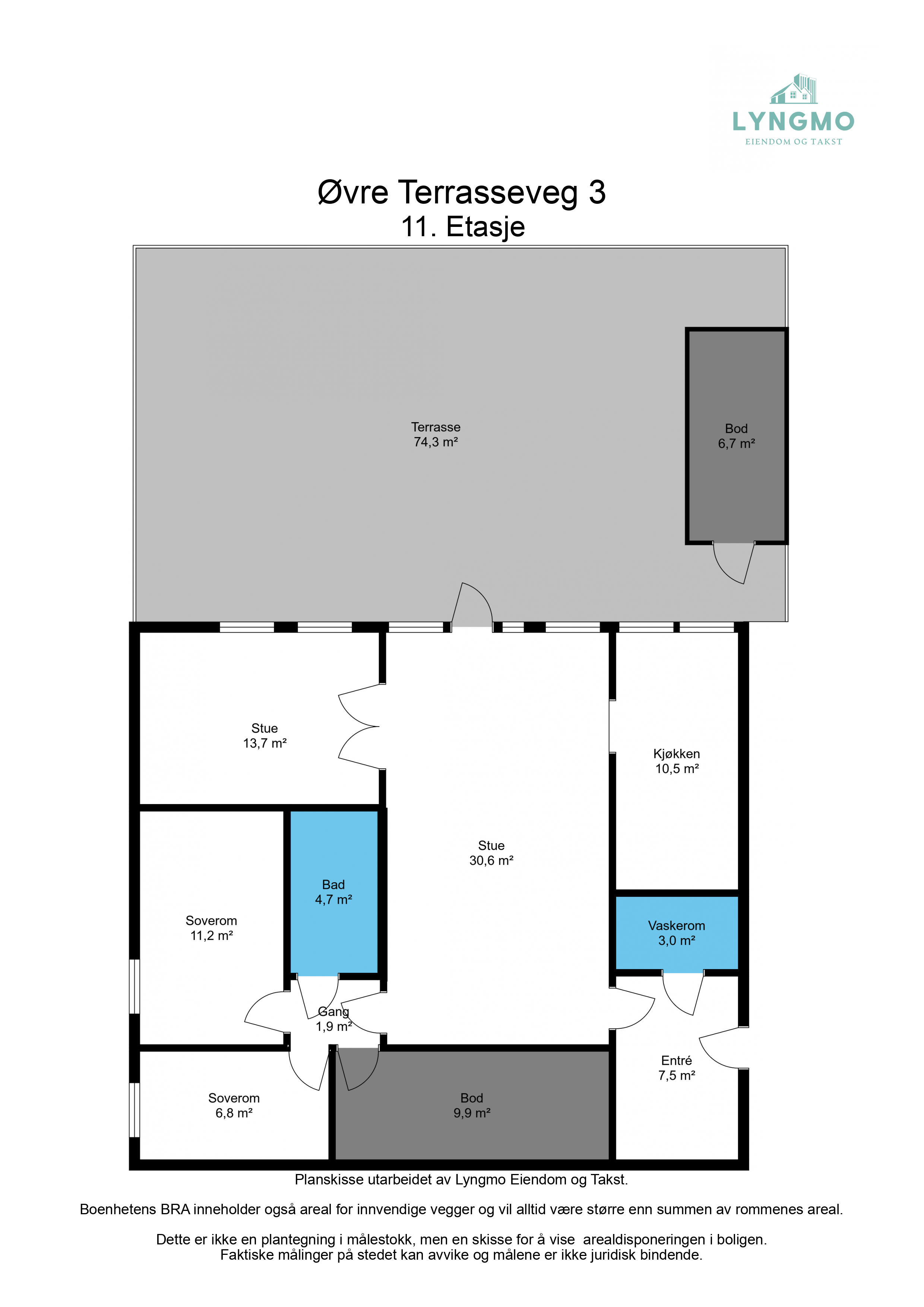 Leilighet: Entrè, vaskerom, stue, kjøkken, gang, 3 soverom, bad/wc og bod. Terrasse: Stor utvendig bod på terrassen. Elektrisk markise over stuevinduer. Fastmontert pergola med justerbar vegg.