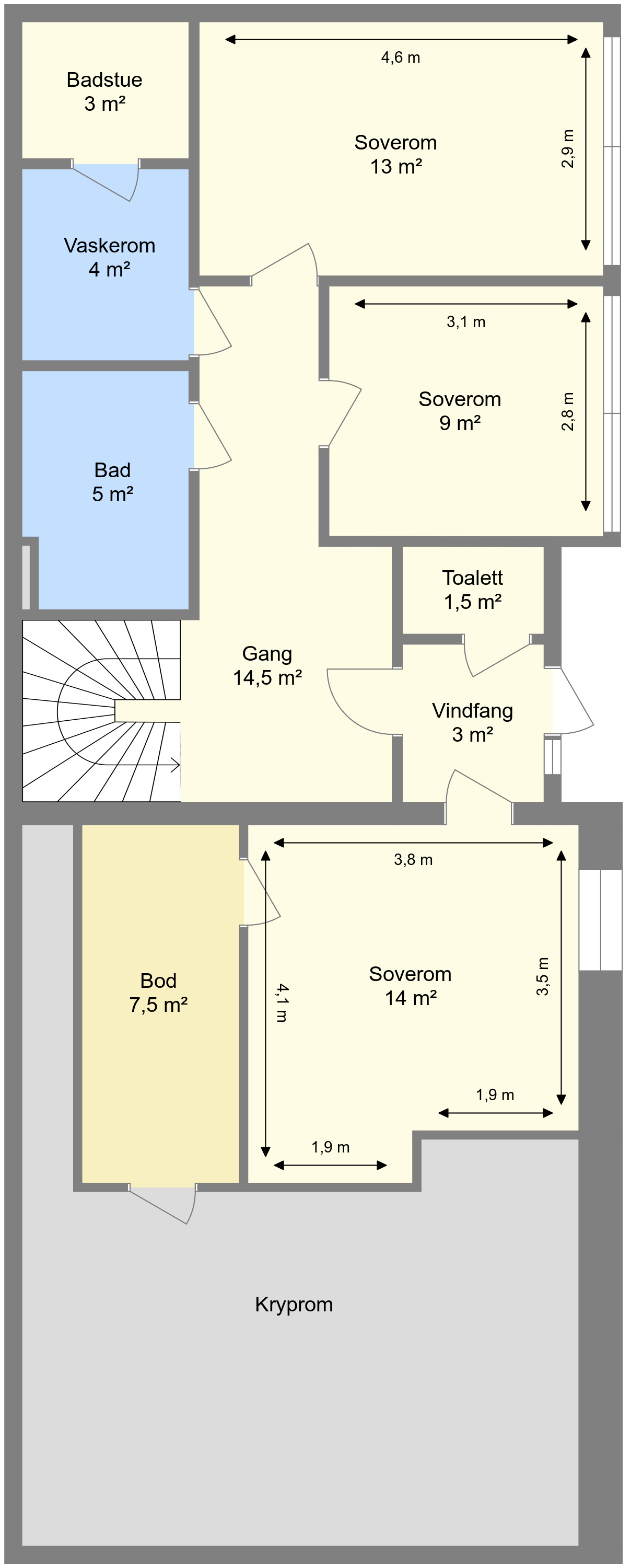 - 4 rom som er innredet som soverom på hhv 14m², 13m², 9m² og 8m².
