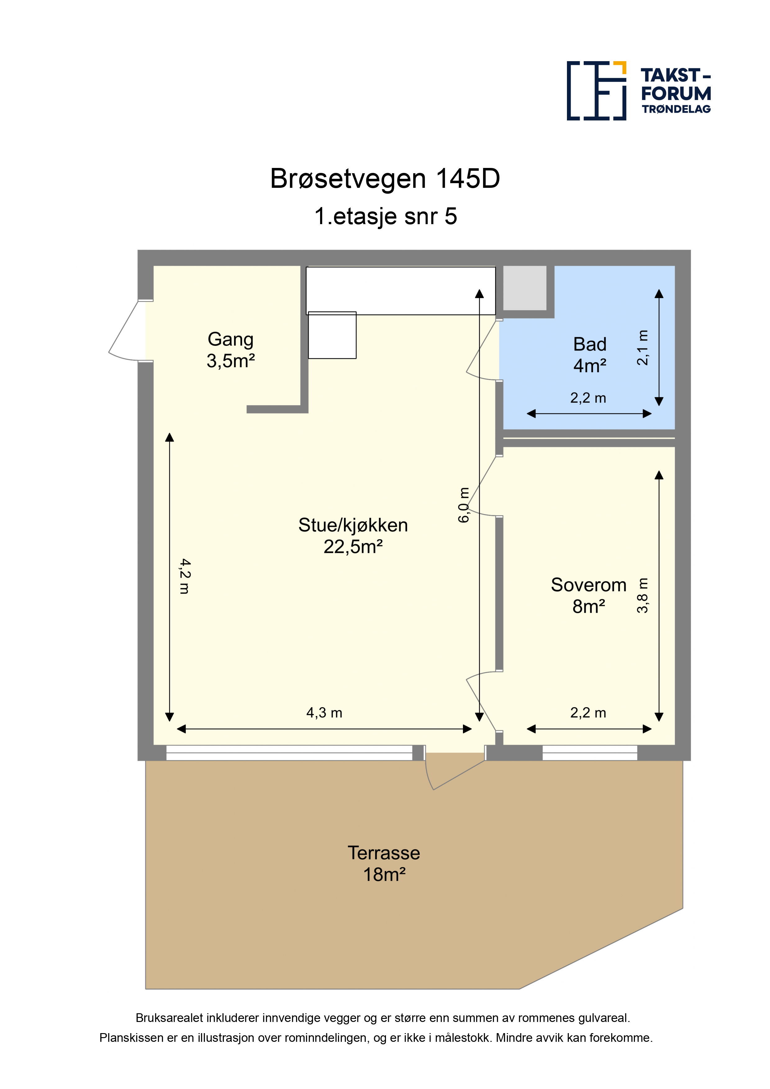 AREAL Areal i salgsoppgaven er hentet fra tilstandsrapporten. Boligens areal oppgis i BRA (bruksareal), som deles i underkategoriene BRA-i (arealet innenfor boenheten), BRA-e (arealet utenfor boenheten(e) og som tilhører denne, slik som for eksempel boder hvor adkomsten er utenfor boenheten), og BRA-b (arealet av innglasset balkong, veranda eller altan når denne er tilknyttet boenheten). TBA er arealet av terrasser, åpne balkonger og åpen altan tilknyttet boenheten. Arealoppmåling er foretatt av takstmann etter bransjestandarden "Takstbransjens retningslinjer ved arealmåling av boliger". Retningslinjene har NS 3940:2012 som utgangspunkt, men inneholder presiseringer for arealbegreper og definisjoner i forbindelse med arealmåling. De forskjellige rom i boligen er beskrevet etter dagens bruk av rommet på befaringstidspunktet, selv om bruken av rommet kan være i strid med tidligere eller gjeldende byggeforskrifter. Benevnelsen av de enkelte rom fastsettes etter skjønn fra takstmannen. D-NUMMER Dersom kjøper er utenlandsk statsborger kreves det at vedkommende har D-nummer til erstatning for norsk personnummer. Søknad om D-nummer sendes til Kartverket samtidig med innsending av skjøtet for tinglysing. Kartverket oppbevarer skjøtet inntil kjøper har fått D-nummer av skatteetaten. Skjøtet vil bli tinglyst så snart Kartverket har mottatt kjøpers D-nummer fra Skatteetaten. Søknad om D-nummer i forbindelse med tinglysing av skjøte kan medføre at oppgjør og utbetaling til selger blir forsinket. Kjøper må i disse tilfellene ta forbehold i bud om at D-nummer blir gitt, samt at dette kan medføre forsinket utbetaling til selger. Kontakt megler for informasjon før budgivning. SALGSSUM Etter aksept av bud, vil eiendommens salgssum bli meddelt de som ev. måtte etterspørre denne. Eiendommens salgssum vil bli offentlig tilgjengelig ved overføring av hjemmel. Areal i salgsoppgaven er hentet fra tilstandsrapporten. Fordelingen mellom primærrom (P-rom) og sekundærrom (S-rom) er basert på bruken av rommene på befaringstidspunktet. Rommenes bruk kan derfor være i strid med byggeforskriftene og/eller registrert/godkjent bruk. ERVERVSBEGRENSNING Etter eierseksjonsloven § 23 kan ingen kjøpe en boligseksjon hvis kjøpet fører til at man, direkte eller indirekte, blir eier av flere enn to boligseksjoner i eierseksjonssameiet. Begrensningen gjelder ikke kjøp av fritidsboliger. Det finnes også enkelte andre unntak i bestemmelsen. Dersom et erverv har funnet sted i strid med eierseksjonslovens regler kan Kartverket nekte overskjøting. Dersom overskjøting blir nektet, er kjøper likevel forpliktet til å gjennomføre handelen med selger, og oppgjør til selger vil finne sted tross manglende overskjøting. SAMARBEIDSPARTNERE Foretaket samarbeider med følgende foretak som tilbyr produkter eller tjenester i forbindelse med oppdraget: - Help forsikring - Södeberg & Partners - Banker i Eika-alliansen - Leverandører knyttet til Aktiv pluss (for eksempel flyttehjelp) - Leverandører knyttet til Visma Meglerfront (for eksempel strømleverandører)