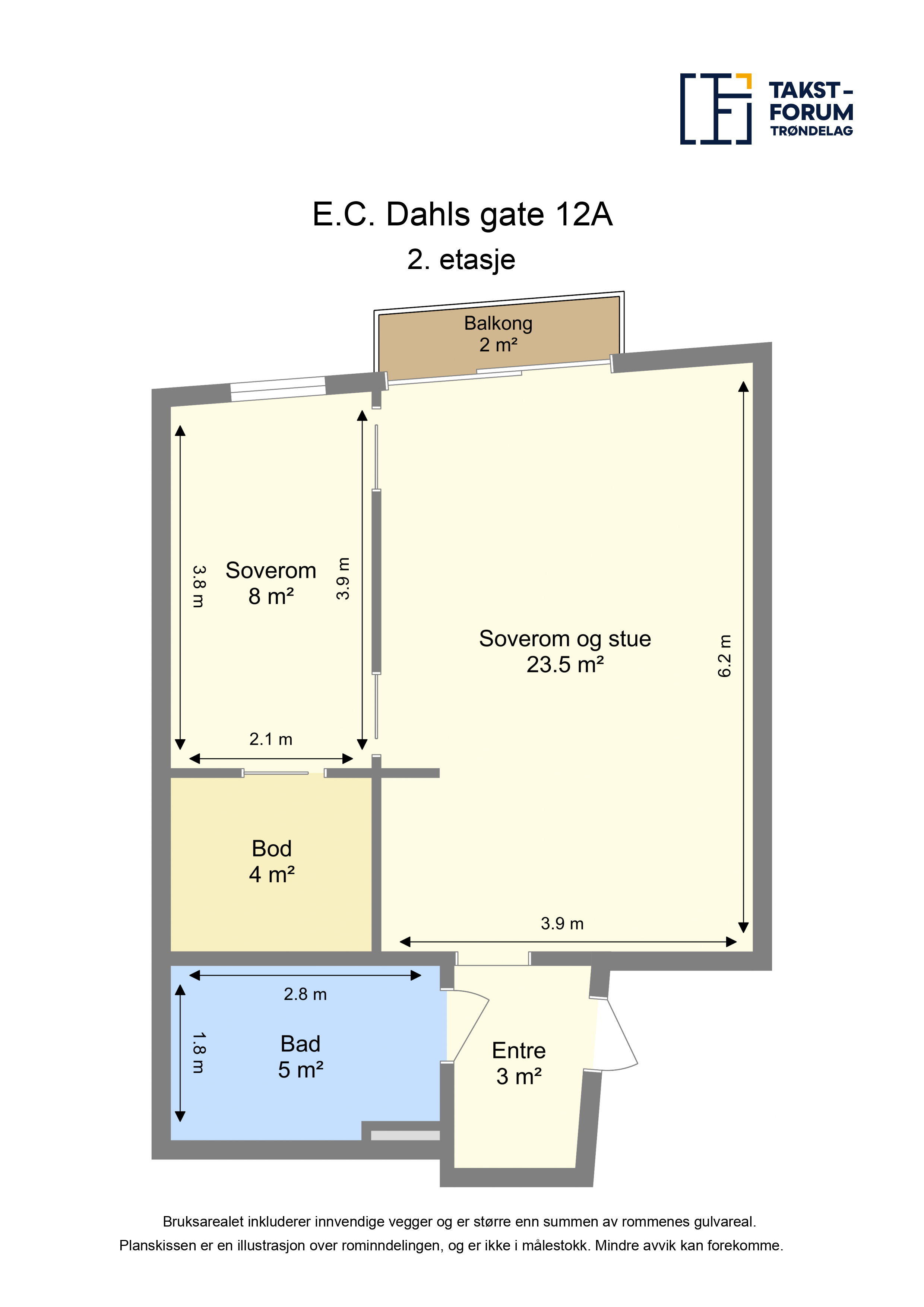 AREAL Areal i salgsoppgaven er hentet fra tilstandsrapporten. Boligens areal oppgis i BRA (bruksareal), som deles i underkategoriene BRA-i (arealet innenfor boenheten), BRA-e (arealet utenfor boenheten(e) og som tilhører denne, slik som for eksempel boder hvor adkomsten er utenfor boenheten), og BRA-b (arealet av innglasset balkong, veranda eller altan når denne er tilknyttet boenheten). TBA er arealet av terrasser, åpne balkonger og åpen altan tilknyttet boenheten. Arealoppmåling er foretatt av takstmann etter bransjestandarden "Takstbransjens retningslinjer ved arealmåling av boliger". Retningslinjene har NS 3940:2012 som utgangspunkt, men inneholder presiseringer for arealbegreper og definisjoner i forbindelse med arealmåling. De forskjellige rom i boligen er beskrevet etter dagens bruk av rommet på befaringstidspunktet, selv om bruken av rommet kan være i strid med tidligere eller gjeldende byggeforskrifter. Benevnelsen av de enkelte rom fastsettes etter skjønn fra takstmannen. D-NUMMER Dersom kjøper er utenlandsk statsborger kreves det at vedkommende har D-nummer til erstatning for norsk personnummer. Søknad om D-nummer sendes til Kartverket samtidig med innsending av skjøtet for tinglysing. Kartverket oppbevarer skjøtet inntil kjøper har fått D-nummer av skatteetaten. Skjøtet vil bli tinglyst så snart Kartverket har mottatt kjøpers D-nummer fra Skatteetaten. Søknad om D-nummer i forbindelse med tinglysing av skjøte kan medføre at oppgjør og utbetaling til selger blir forsinket. Kjøper må i disse tilfellene ta forbehold i bud om at D-nummer blir gitt, samt at dette kan medføre forsinket utbetaling til selger. Kontakt megler for informasjon før budgivning. SALGSSUM Etter aksept av bud, vil eiendommens salgssum bli meddelt de som ev. måtte etterspørre denne. Eiendommens salgssum vil bli offentlig tilgjengelig ved overføring av hjemmel. SAMARBEIDSPARTNERE Foretaket samarbeider med følgende foretak som tilbyr produkter eller tjenester i forbindelse med oppdraget: - Help forsikring - Södeberg & Partners - Banker i Eika-alliansen - Leverandører knyttet til Aktiv pluss (for eksempel flyttehjelp) - Leverandører knyttet til Visma Meglerfront (for eksempel strømleverandører) ERVERVSBEGRENSNING Etter eierseksjonsloven § 23 kan ingen kjøpe en boligseksjon hvis kjøpet fører til at man, direkte eller indirekte, blir eier av flere enn to boligseksjoner i eierseksjonssameiet. Begrensningen gjelder ikke kjøp av fritidsboliger. Det finnes også enkelte andre unntak i bestemmelsen.