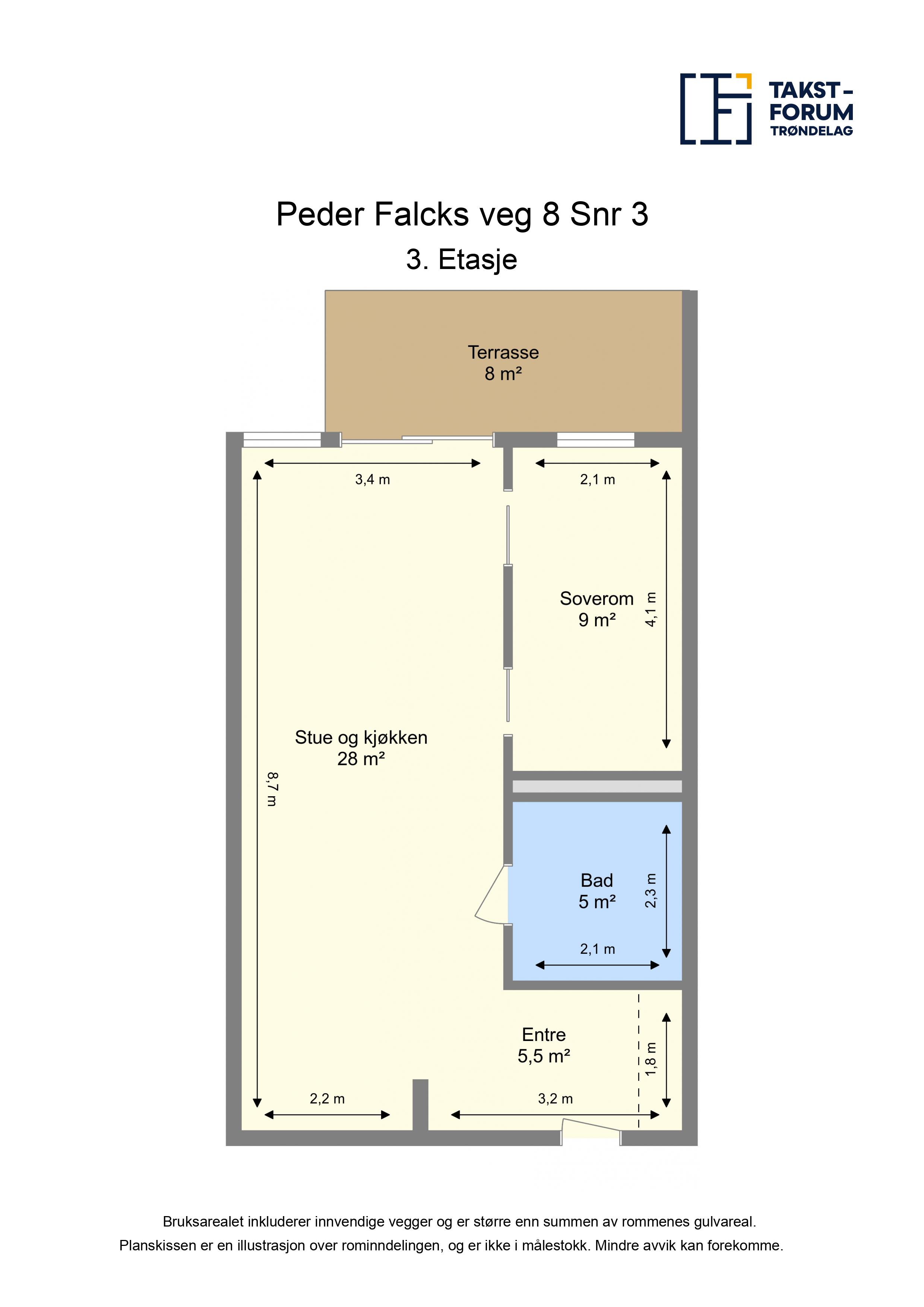 AREAL Areal i salgsoppgaven er hentet fra tilstandsrapporten. Boligens areal oppgis i BRA (bruksareal), som deles i underkategoriene BRA-i (arealet innenfor boenheten), BRA-e (arealet utenfor boenheten(e) og som tilhører denne, slik som for eksempel boder hvor adkomsten er utenfor boenheten), og BRA-b (arealet av innglasset balkong, veranda eller altan når denne er tilknyttet boenheten). TBA er arealet av terrasser, åpne balkonger og åpen altan tilknyttet boenheten. Arealoppmåling er foretatt av takstmann etter bransjestandarden "Takstbransjens retningslinjer ved arealmåling av boliger". Retningslinjene har NS 3940:2012 som utgangspunkt, men inneholder presiseringer for arealbegreper og definisjoner i forbindelse med arealmåling. De forskjellige rom i boligen er beskrevet etter dagens bruk av rommet på befaringstidspunktet, selv om bruken av rommet kan være i strid med tidligere eller gjeldende byggeforskrifter. Benevnelsen av de enkelte rom fastsettes etter skjønn fra takstmannen. D-NUMMER Dersom kjøper er utenlandsk statsborger kreves det at vedkommende har D-nummer til erstatning for norsk personnummer. Søknad om D-nummer sendes til Kartverket samtidig med innsending av skjøtet for tinglysing. Kartverket oppbevarer skjøtet inntil kjøper har fått D-nummer av skatteetaten. Skjøtet vil bli tinglyst så snart Kartverket har mottatt kjøpers D-nummer fra Skatteetaten. Søknad om D-nummer i forbindelse med tinglysing av skjøte kan medføre at oppgjør og utbetaling til selger blir forsinket. Kjøper må i disse tilfellene ta forbehold i bud om at D-nummer blir gitt, samt at dette kan medføre forsinket utbetaling til selger. Kontakt megler for informasjon før budgivning. ERVERVSBEGRENSNING Etter eierseksjonsloven § 23 kan ingen kjøpe en boligseksjon hvis kjøpet fører til at man, direkte eller indirekte, blir eier av flere enn to boligseksjoner i eierseksjonssameiet. Begrensningen gjelder ikke kjøp av fritidsboliger. Det finnes også enkelte andre unntak i bestemmelsen. Dersom et erverv har funnet sted i strid med eierseksjonslovens regler kan Kartverket nekte overskjøting. Dersom overskjøting blir nektet, er kjøper likevel forpliktet til å gjennomføre handelen med selger, og oppgjør til selger vil finne sted tross manglende overskjøting. SALGSSUM Etter aksept av bud, vil eiendommens salgssum bli meddelt de som ev. måtte etterspørre denne. Eiendommens salgssum vil bli offentlig tilgjengelig ved overføring av hjemmel. SAMARBEIDSPARTNERE Foretaket samarbeider med følgende foretak som tilbyr produkter eller tjenester i forbindelse med oppdraget: - Help forsikring - Södeberg & Partners - Banker i Eika-alliansen - Leverandører knyttet til Aktiv pluss (for eksempel flyttehjelp) - Leverandører knyttet til Visma Meglerfront (for eksempel strømleverandører)